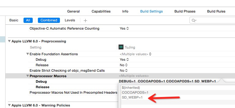 - 在Pods-SDWebImage-Build Settings-Preprocessor macros添加宏SD_WEBP=1启用webp支持